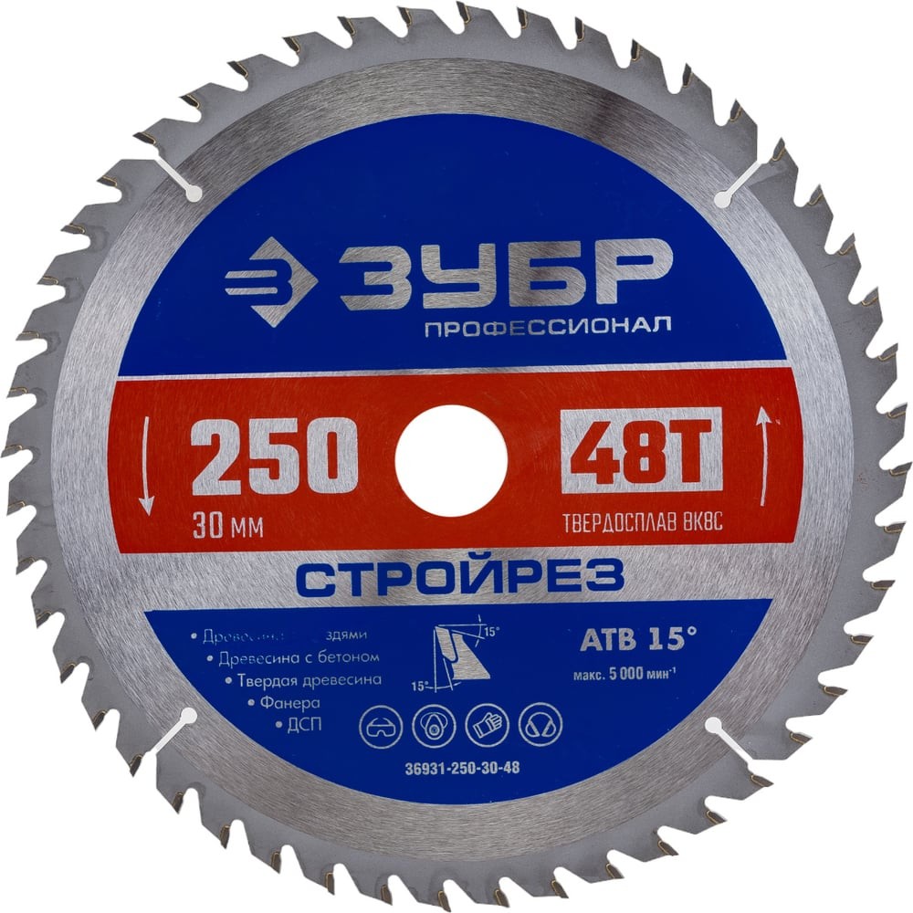 ЗУБР Стройрез, 250 х 30 мм, 48Т, пильный диск по строительной древесине, Профессионал (36931-250-30-48)
