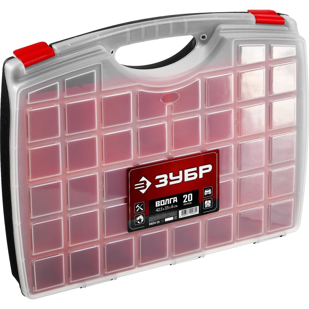 ЗУБР ВОЛГА-20, 425 х 330 х 60 мм, пластиковый органайзер с 20 съемными лотками (38034-20)