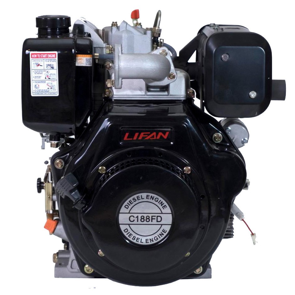 Двигатель дизельный LIFAN C188FD 6A - мощный 4-хтактный, одноцилиндровый двигатель с воздушным охлаждением. Высокий КПД и рабочий ресурс позволяет применять двигатель в сложных условиях эксплуатации, а значит, и устанавливать на различную технику, для которой необходимы мощность и экономия. Данная дизельная установка отличается компактными размерами, высоким запасом ресурса использования и приемлемой ценой, что играет важную роль при выборе. Запуск осуществляется с помощью ручного и электро-стартера.