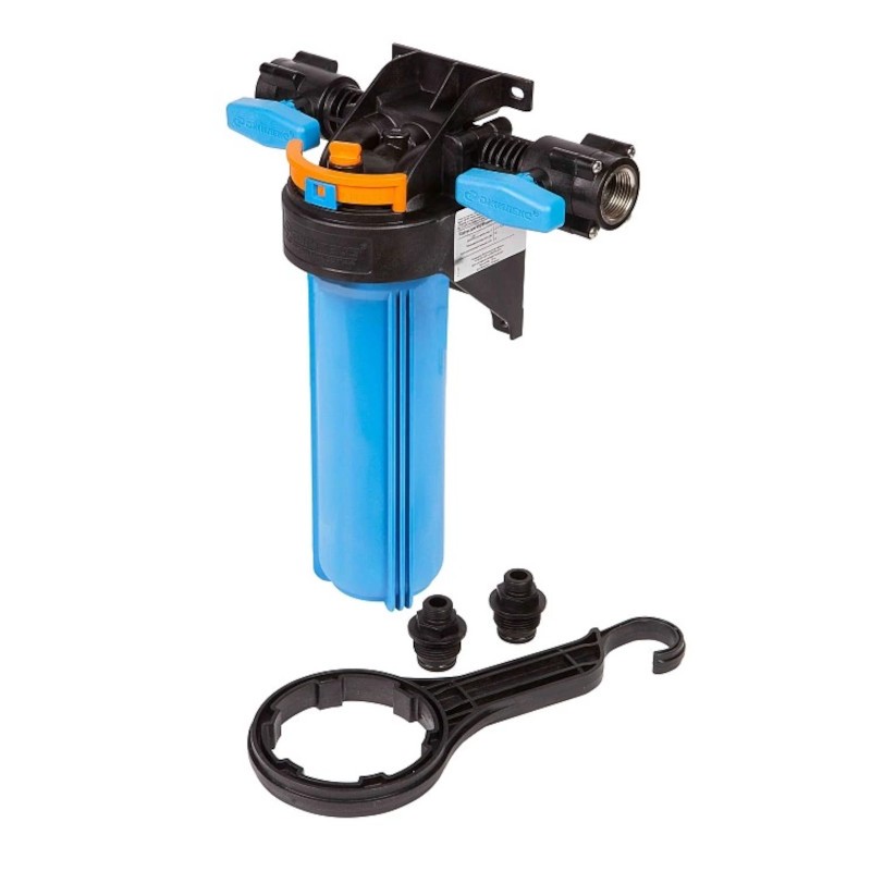 Прочная полимерная колба Календарь даты замены фильтра Съемный коллектор Шаровые краны на концах коллектора Пробка для сброса избыточного давления Сливной клапан Съемный коллектор |