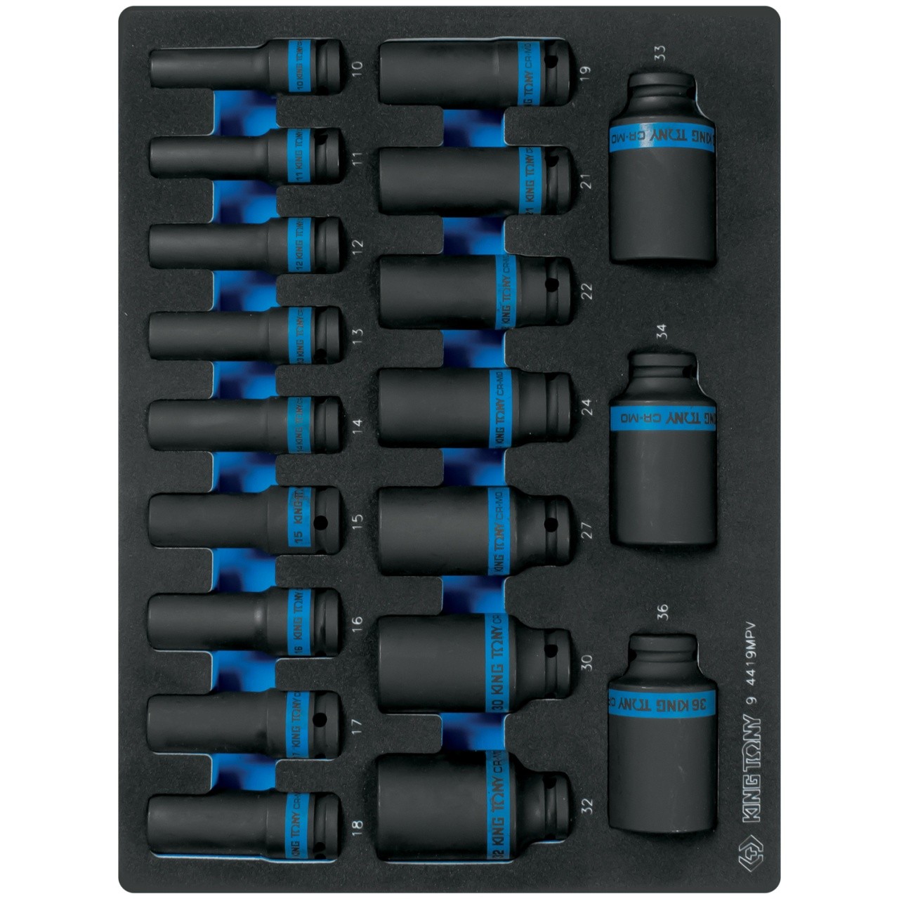 Набор ударных глубоких торцевых головок 1/2", шестигранные, 10-36 мм, ложемент, 19 предметов KING TO
