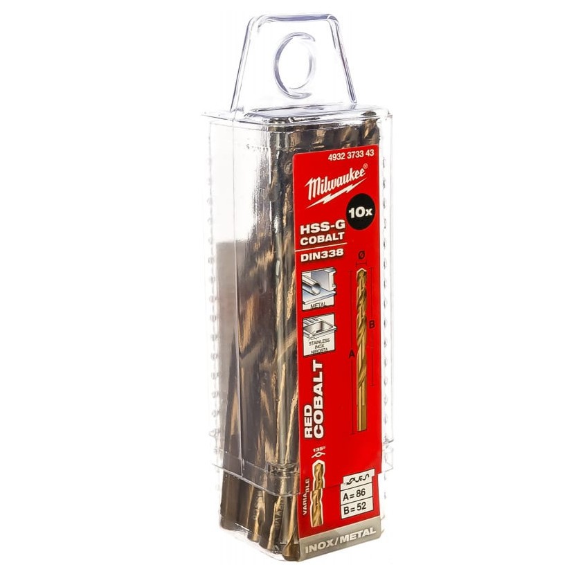 Сверло по металлу Milwaukee HSS-CO 5x86мм 10шт (343) из прочной и устойчивой к нагреву быстрорежущей стали с 5% добавлением кобальта. Применяется для сверления высоколегированных сталей и металлов с пределом прочности на разрыв свыше 1000 Н/мм2, например, нержавеющая сталь.