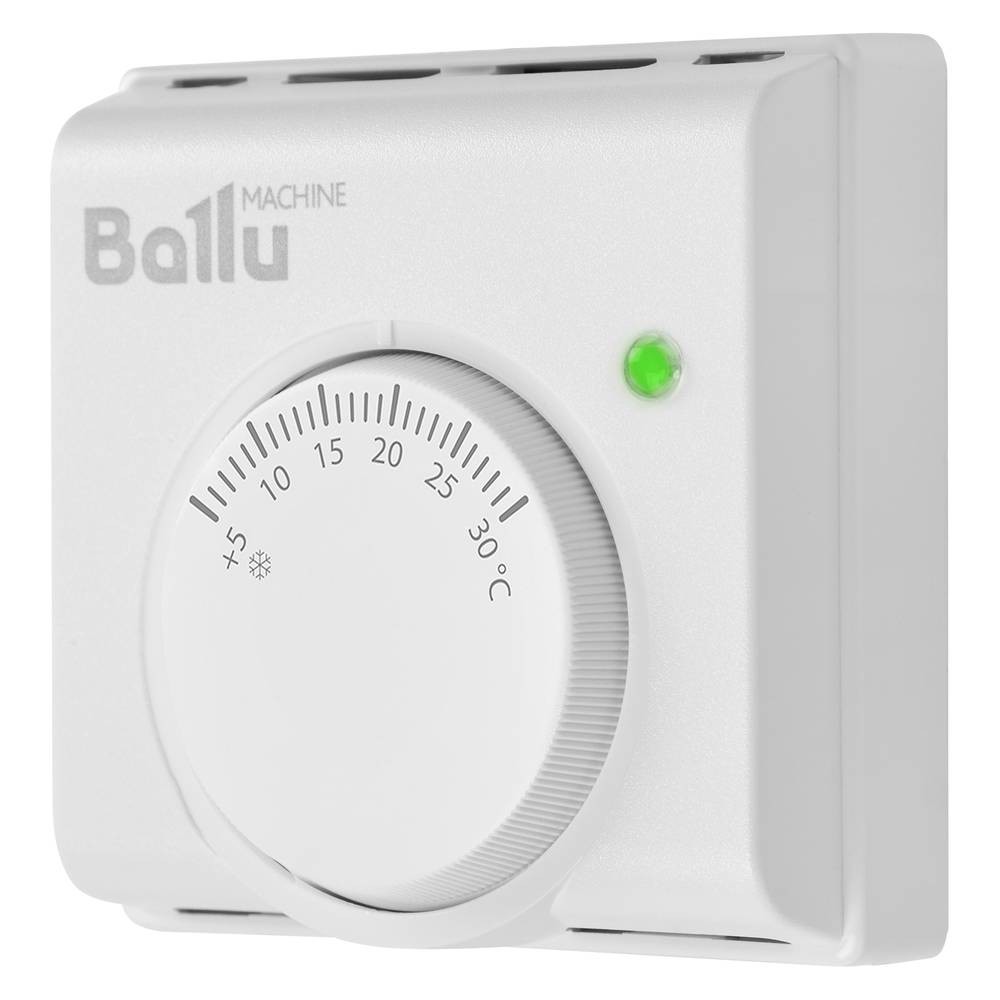 Термостат Ballu BMT-2 предназначен для поддержания заданной температуры в помещении, применяется совместно с климатической техникой (обогревателями, вентиляторами, охлаждающими приборами). Рекомендуется для использования с инфракрасными обогревателями. При понижении или повышении измеряемой температуры относительно заданного значения термостат замыкает или размыкает однополюсный перекидной контакт (алгоритм работы выбирается при подключении). Термостат оснащен выключателем и индикатором работы (лампа ~220–240 В). Максимальный ток коммутации составляет 16А. При токе в 10А - повышенная точность срабатывания и возможность использования бокового выключателя.
