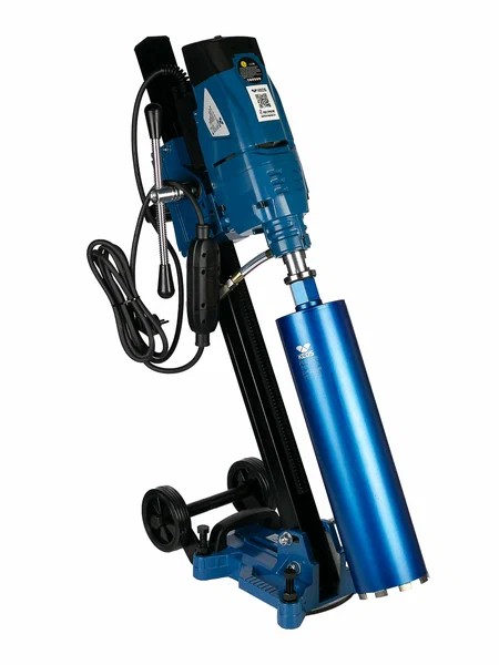 В комплект входит штатив с возможностью регулировки угла наклона от 0 до 45 градусов. Угол легко фиксируется двумя болтами. Для удобства перемещения по стройплощадке, даже с установленным мотором и коронкой, комплект оснащён транспортировочными колёсами.