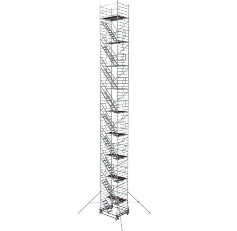 Легкий вес Комфортный подъем по наклонным лестничным маршам с широкими рифлеными ступенями Увеличенная рабочая площадка 1.4х2 м. Нагрузка на площадку 200 кг/м2 (560 кг на настил) Сборка без инструментов, замковое крепление элементов Консоли стабилизаторы для дополнительной устойчивости Поворотные колеса со стопорами Компенсация неровной опорной поверхности при помощи винтовых опор |