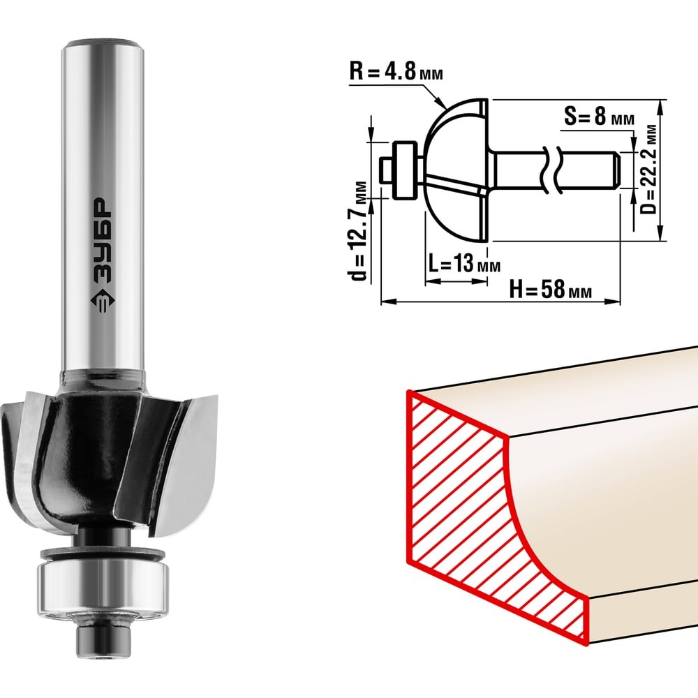 ЗУБР 22.2 x 13 мм, радиус 4.8 мм, фреза кромочная калевочная №2, Профессионал (28785-22.2)