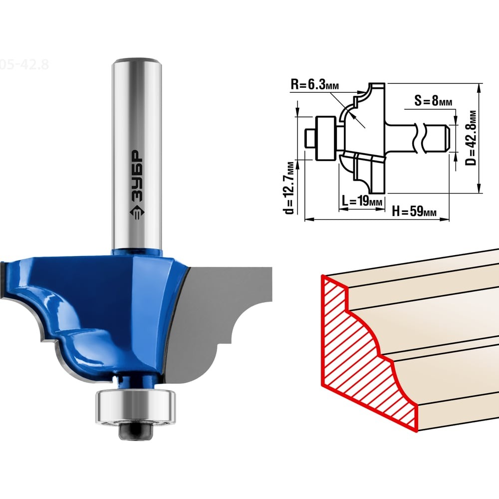 ЗУБР 42.8 x 19 мм, радиус 6.3 мм, фреза кромочная калевочная №4, Профессионал (28705-42.8)