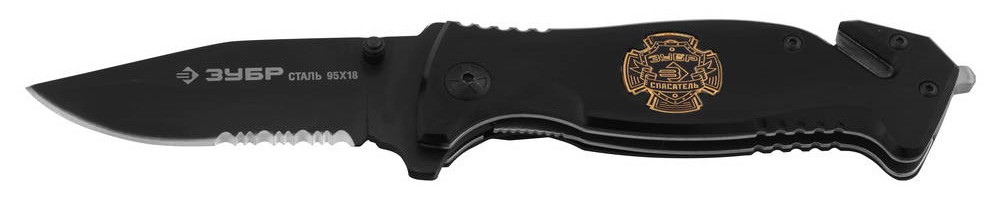 ЗУБР Спасатель, 200 мм, лезвие 90 мм, серрейторная заточка, наконечник для стекол, складной нож (47707)
